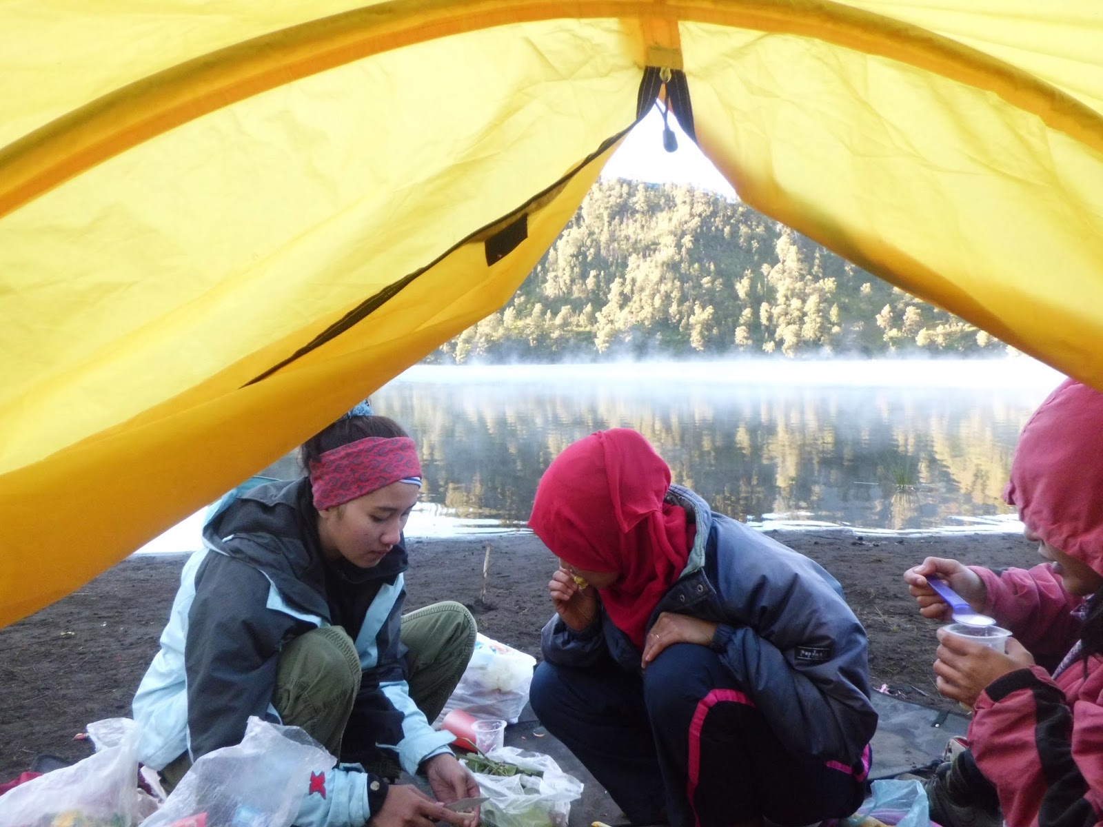 udara dingin pagi ini,.hamparan kabut yg menyelimuti indahnya air suci ranu kumbolo.bercik cahaya yang timbul di dasar air dengan pantulan cahaya matahari. seakan menyuguhkan panadangan ini saat membuka mata.sungguh dingin dan indahnya ranu kumbolo.